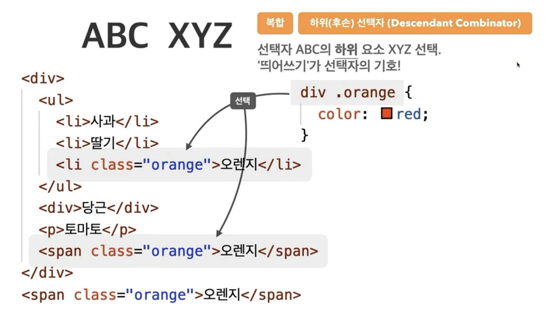 - 일치 선택자 : 선택자 abc 와 xyz를 동시에 만족하는 요소 선택